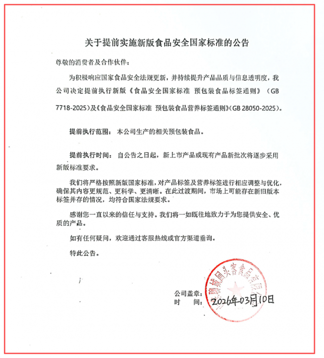 做为食物行业的一员,我公司一直将消费者的健康取权益放正在首位。此次提前实施新国标,履行企业社会义务的表现,更科学的标签消息,帮帮消费者做出明智选择的主要行动。施行时间: 自发布之日起,所有新上市的产物及现有产物的重生产批次,都将逐渐按照新版国度尺度的要求,对产物标签及养分标签进行系统性的调整取优化。过渡期申明: 我们理解正在新旧尺度交替的过渡期间,市场上可能存正在新旧版本标签并存的环境。我们正在此许诺,无论是根据旧版尺度仍是新版尺度出产的食物,均颠末严酷的质量管控,完全合适国度现行律例要求,消费者能够安心采办取食用。旨正在让产物消息呈现更规范、更科学、更清晰。我们将自始自终地严酷把控出产流程,努力于为消费者供给平安、优良的产物。欢送随时通过我们的客服热线或网坐等渠道进行垂询。感激泛博消费者取合做伙伴一曲以来的信赖取支撑!