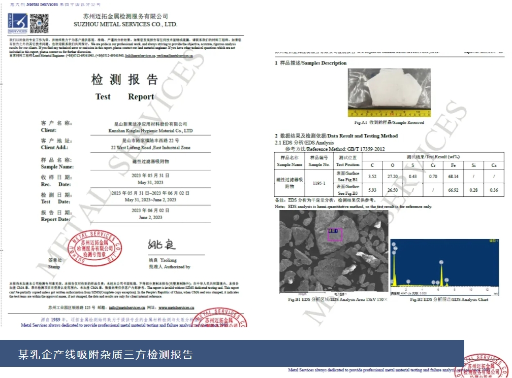 该当乳企要求,对该杂质样本送检;颠末第三方检测布局阐发,吸附物以铁氧化物为从(94。38%),次要成分为无机残留物和微量矿物质,全体合适乳品⽣产线的典型杂质特征。